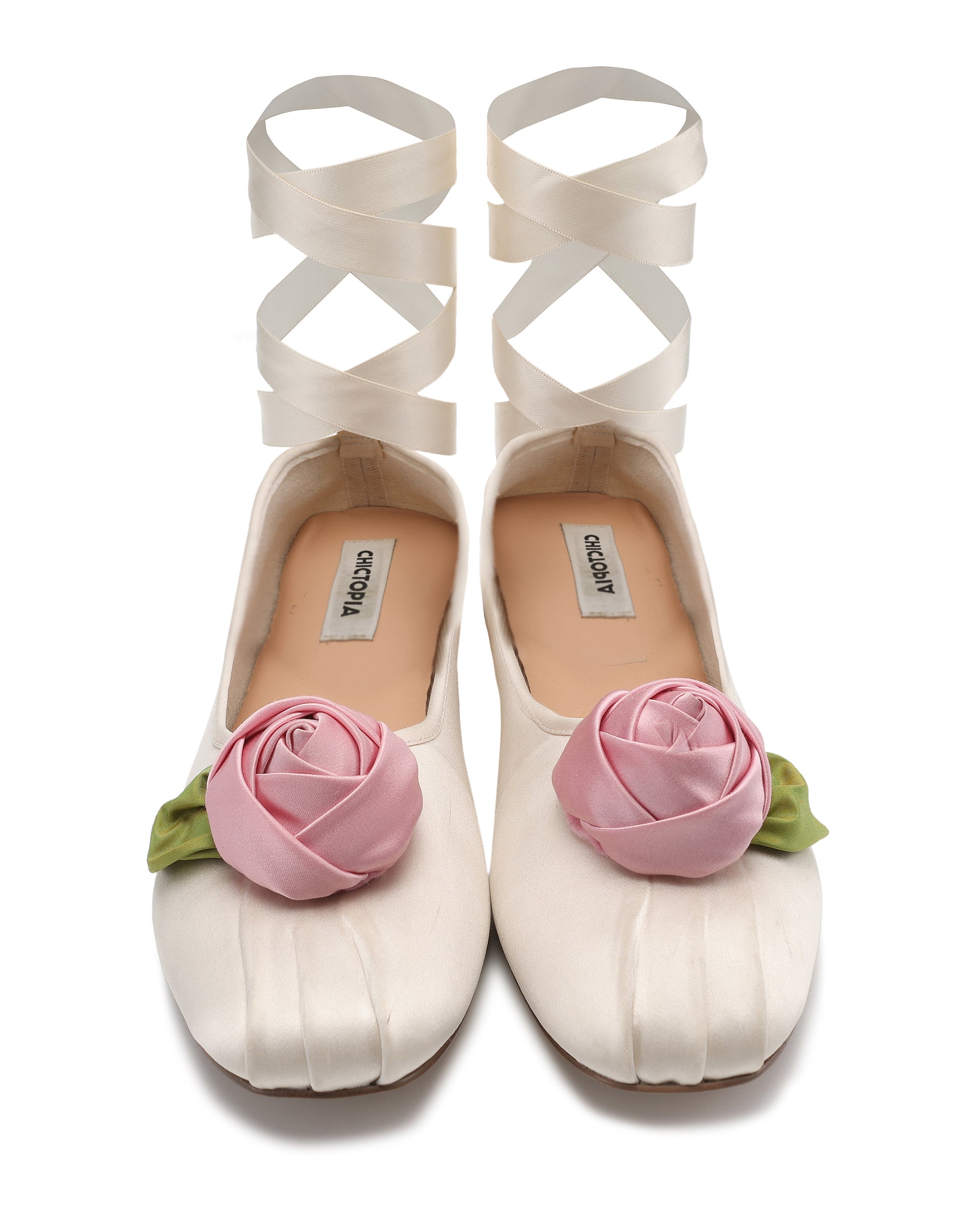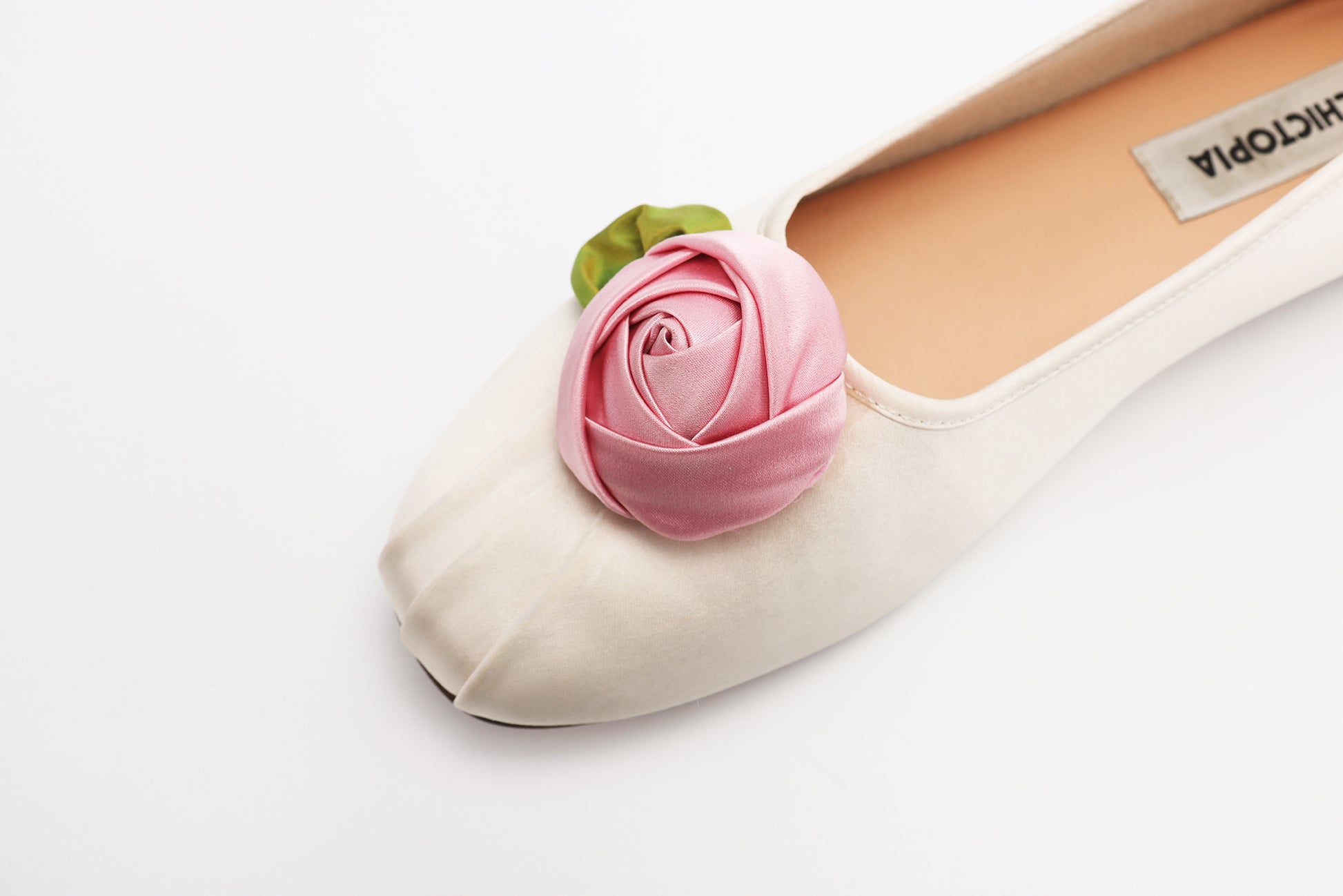 - Silk satin rose appliqué on the vamp